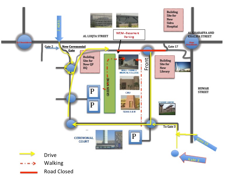 1. Please see location map showing available parking options. It is more convenient to use Gate 2 to enter Education City. At the first roundabout take the third exit towards the WCM-Q basement parking.
